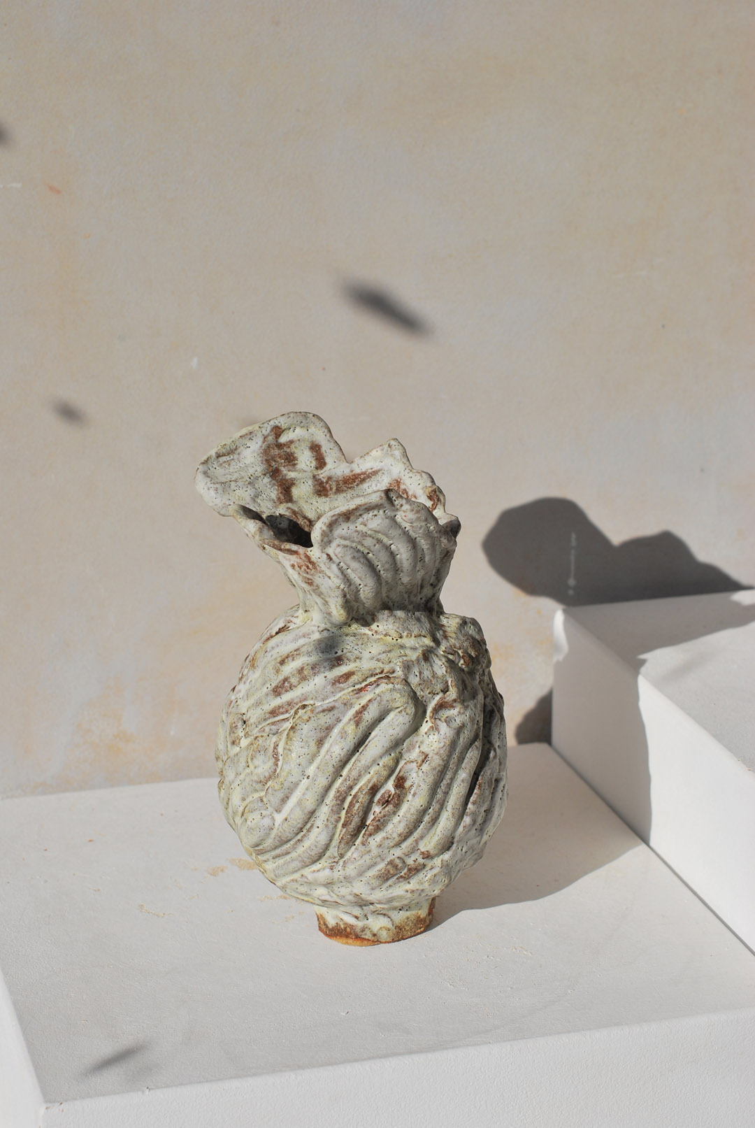 This vessel is handmade using slabs of clay I pressed into molds made during a residency in Lisbon in Spring 2024. It is part of a body of work exploring press molds, ornament and the built environment.